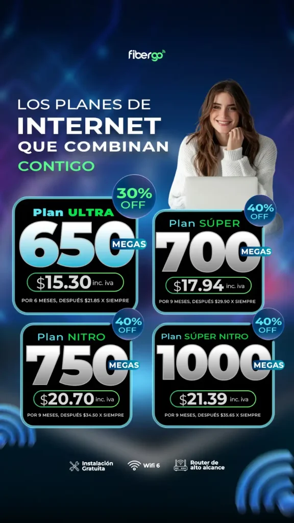 Nuestros planes incluyen equipos de alta potencia. Promoción y tarifas de planes exclusivo para nuevos clientes | Costo promocional de servicio de instalación en nuestros planes: $0.00 Precio regular: $140.00. Consultar cobertura en nuestros canales de atención al cliente.